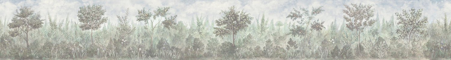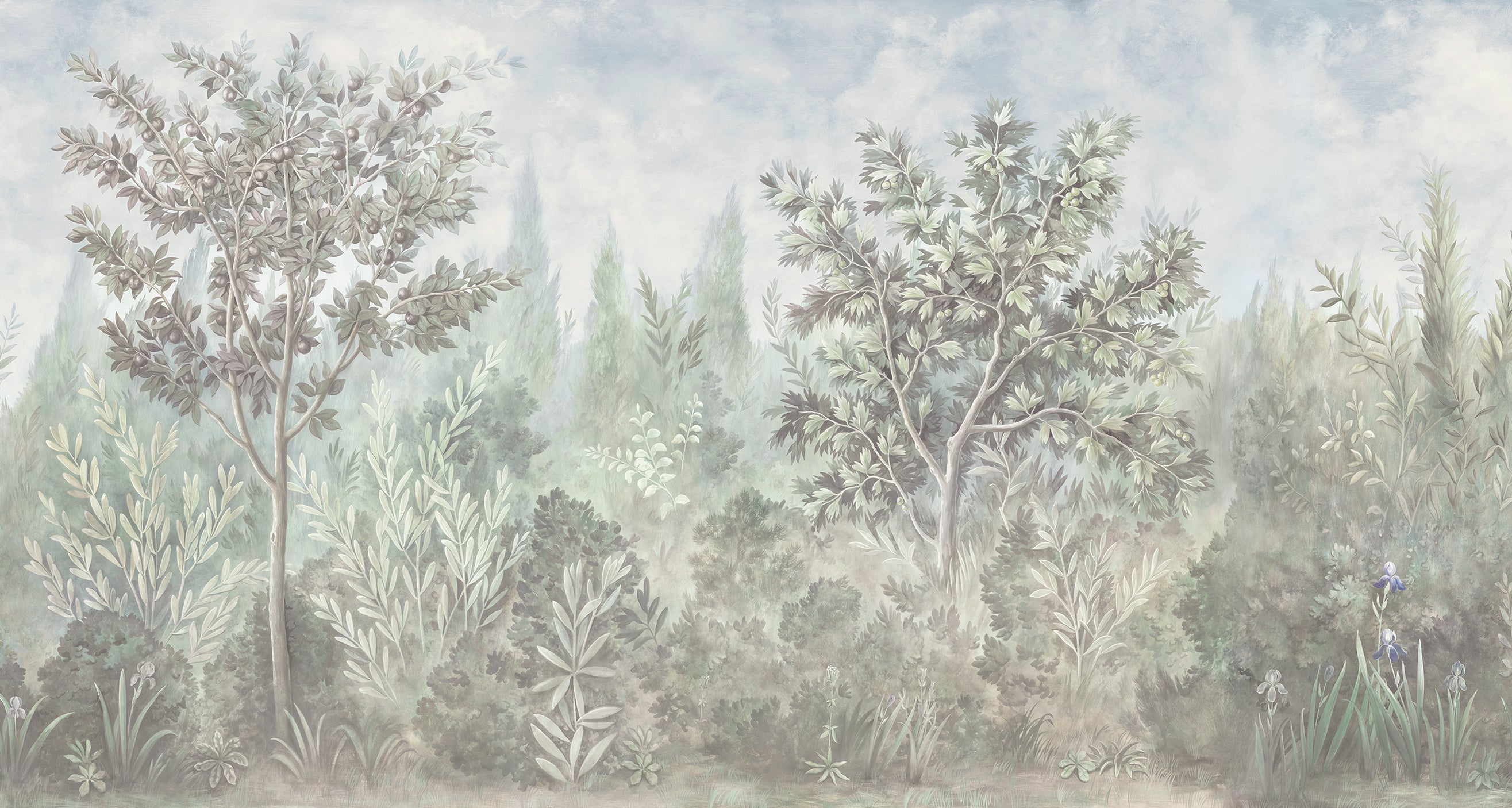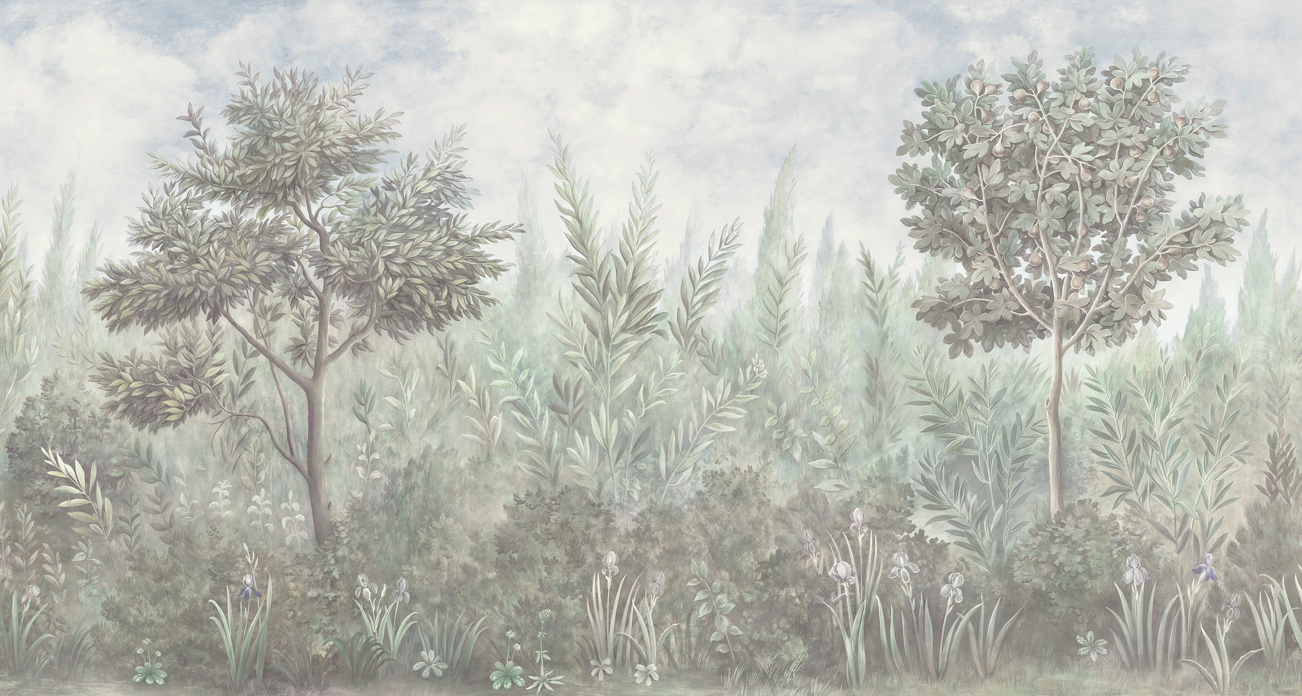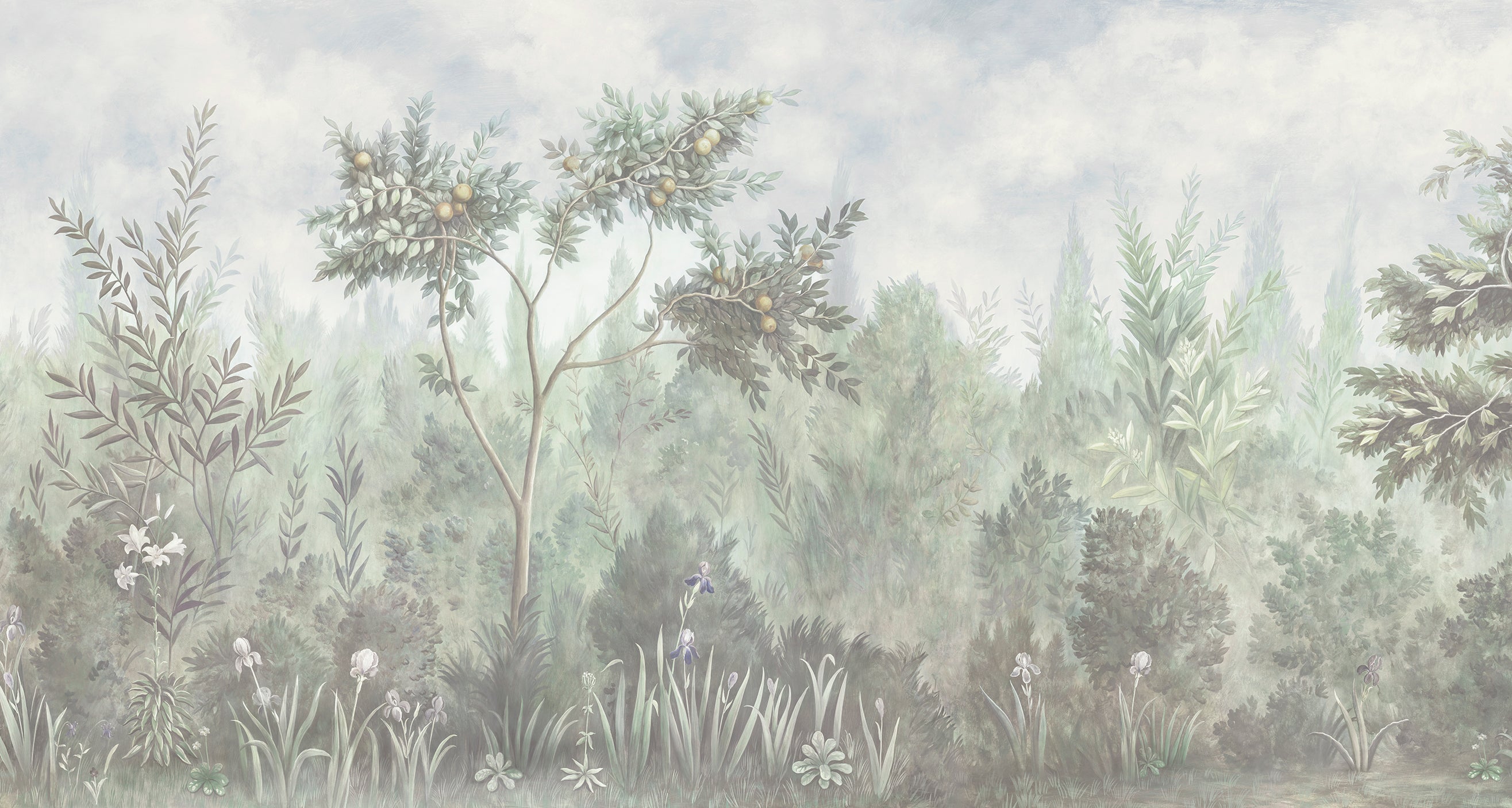 Conceived as a wilder version of a Roman garden set at twilight, our Giardino mural was originally hand painted in a natural palette of lime paints to evoke the spontaneity and opacity of Buon Fresco. The birds have settled-in unseen, adding a sense of stillness to the verdant scene.