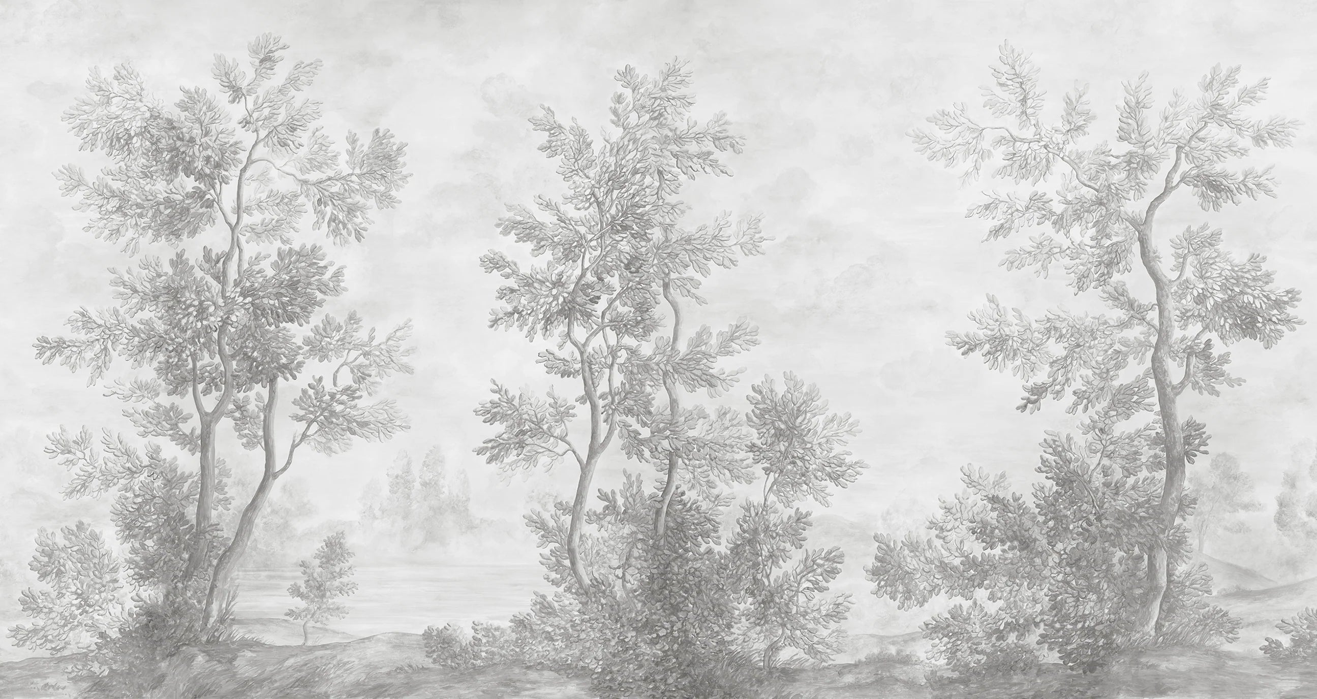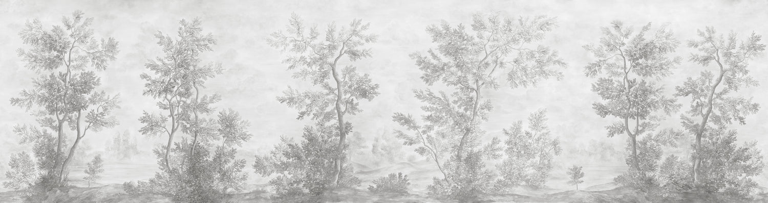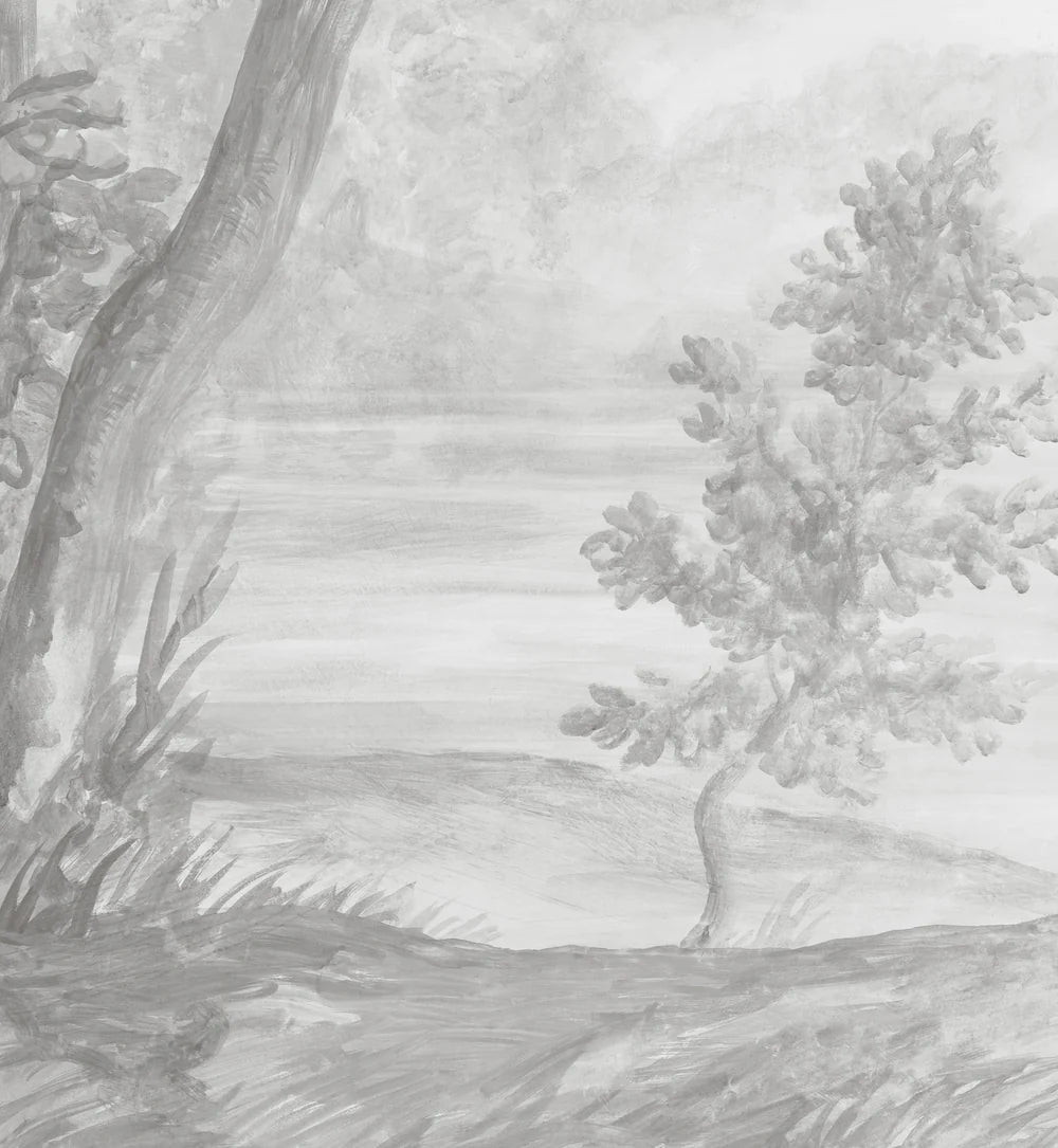 This traditionally-pigmented version of our classically inspired Lorrain grisaille scenic pays subtle tribute to the monochromatic watercolor sketches of celebrated French artist Claude Lorrain, one of the first artists to focus primarily on the landscape. Its spontaneous brushstrokes and luminous background create a feeling of movement and poetry, casting your furnishings clearly in the foreground.