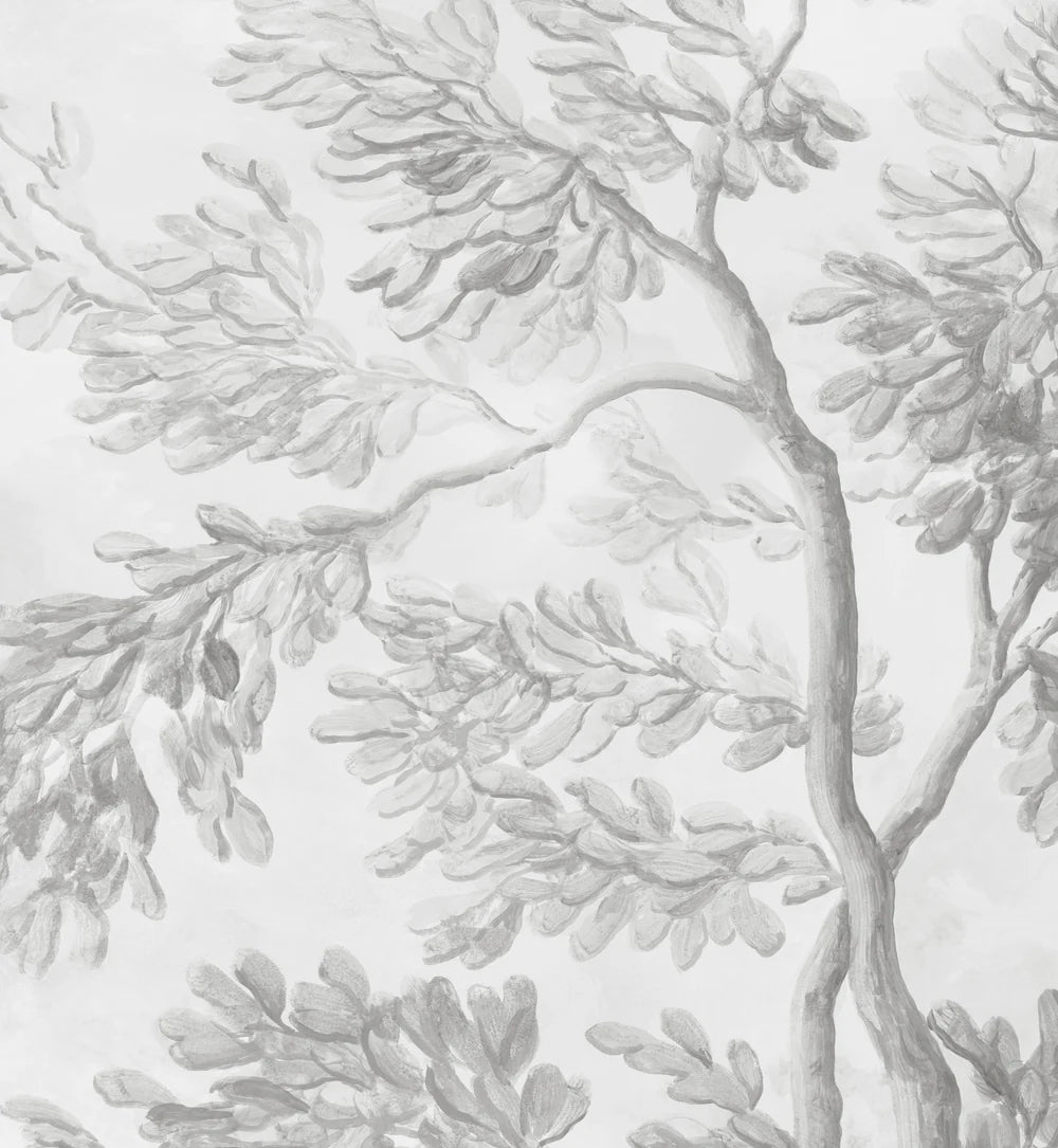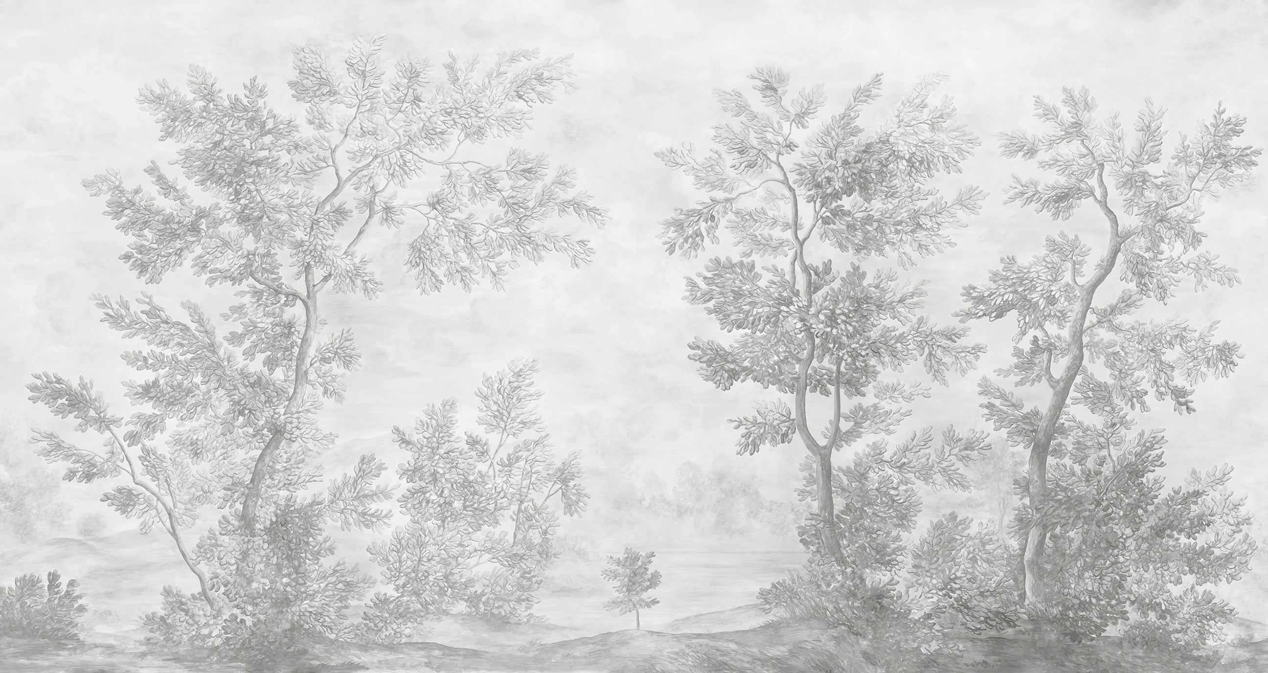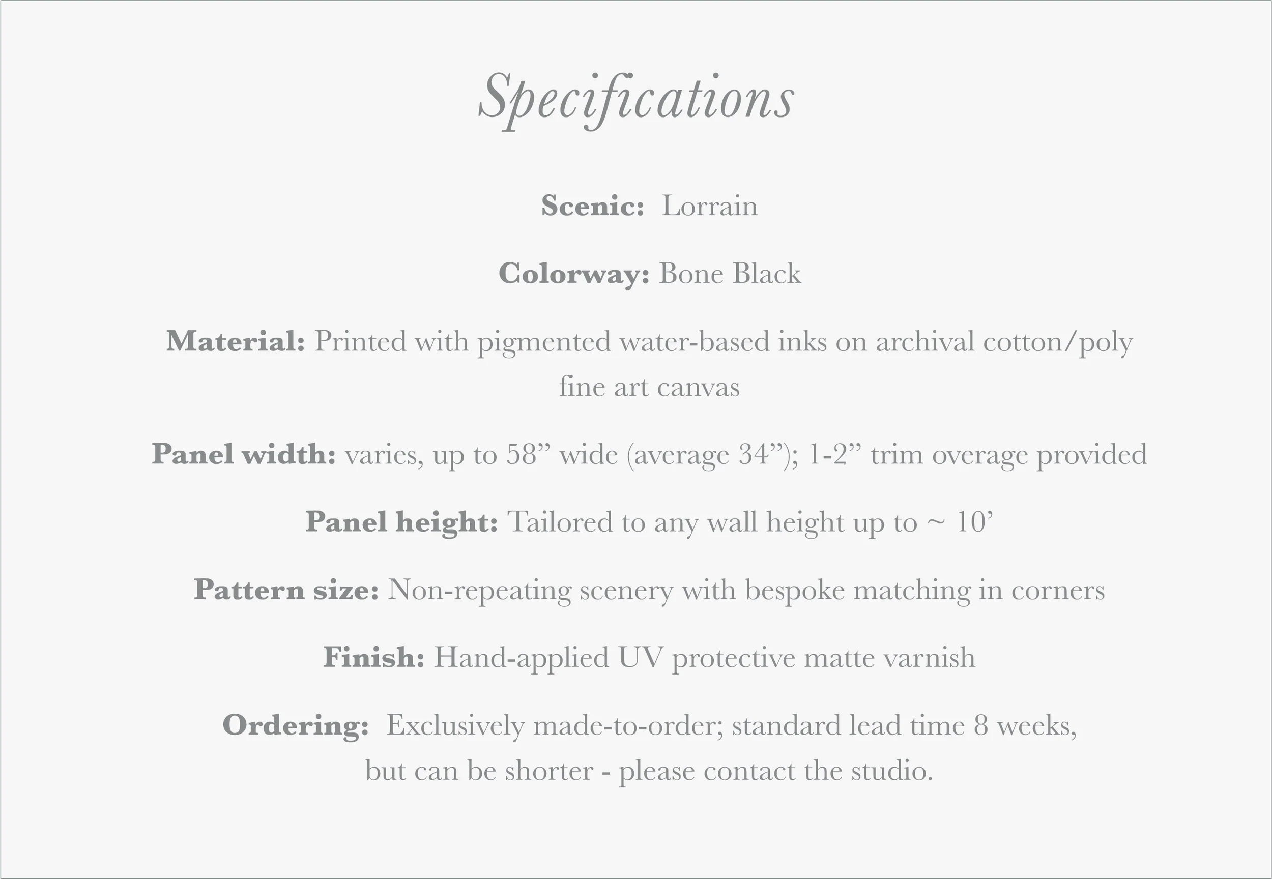 This traditionally-pigmented version of our classically inspired Lorrain grisaille scenic pays subtle tribute to the monochromatic watercolor sketches of celebrated French artist Claude Lorrain, one of the first artists to focus primarily on the landscape. Its spontaneous brushstrokes and luminous background create a feeling of movement and poetry, casting your furnishings clearly in the foreground.