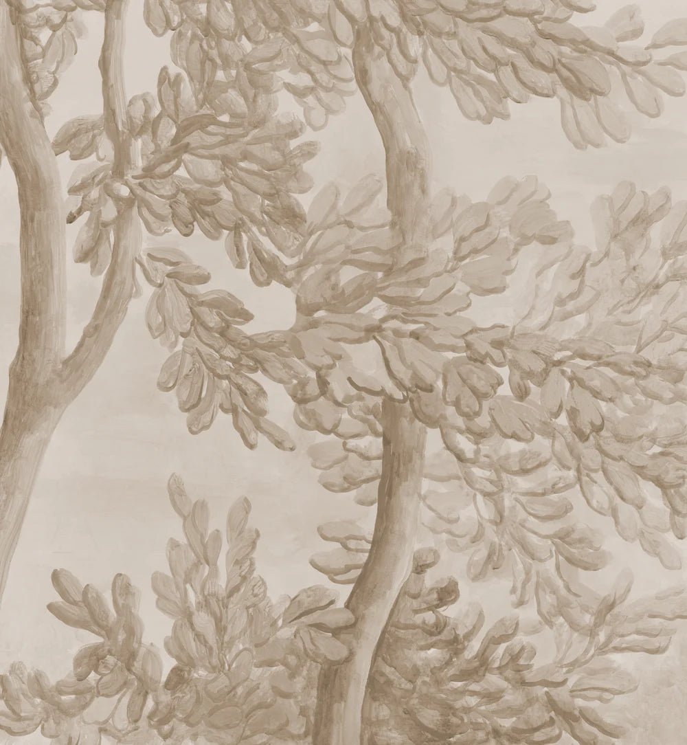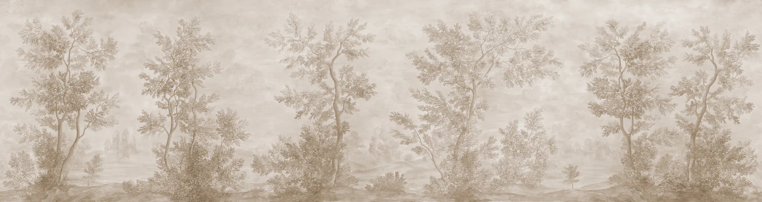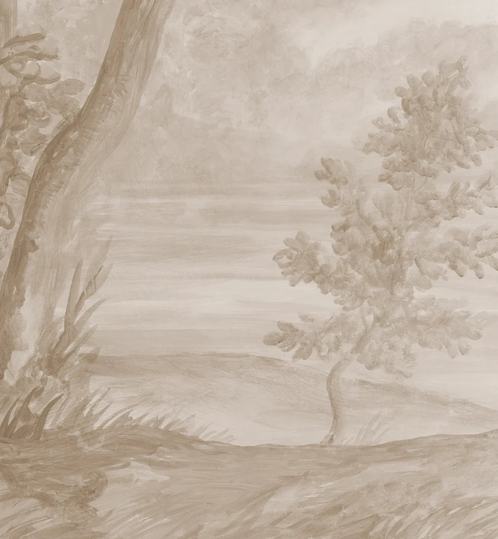 This traditionally-pigmented version of our classically inspired Lorrain grisaille scenic pays subtle tribute to the monochromatic watercolor sketches of celebrated French artist Claude Lorrain, one of the first artists to focus primarily on the landscape. Its spontaneous brushstrokes and luminous background create a feeling of movement and poetry, casting your furnishings clearly in the foreground.