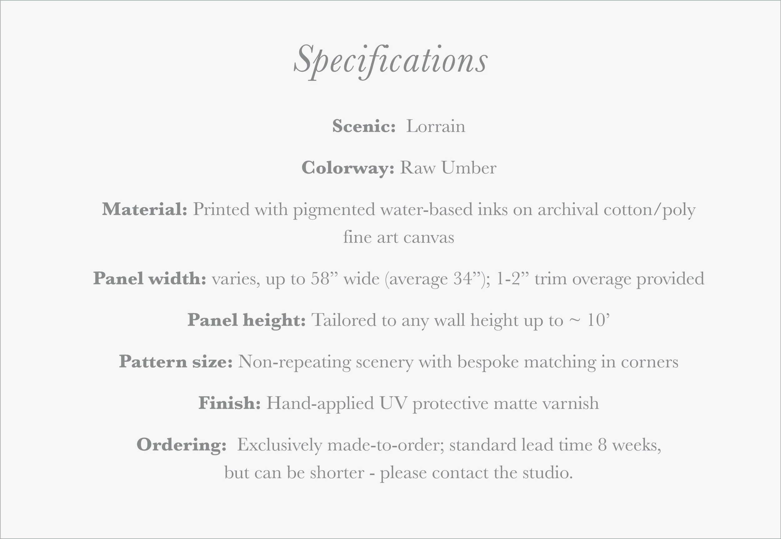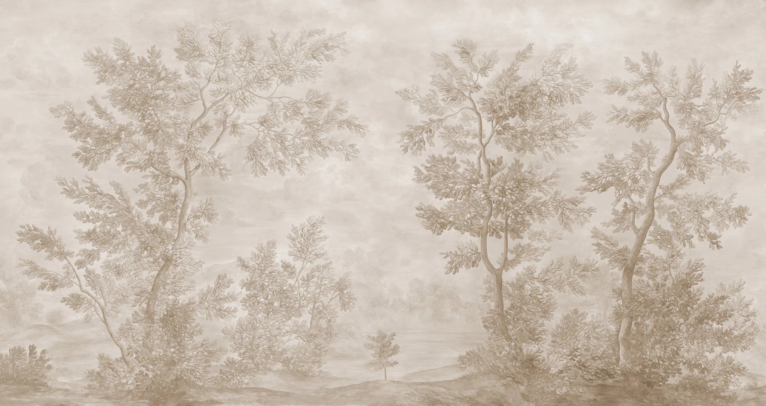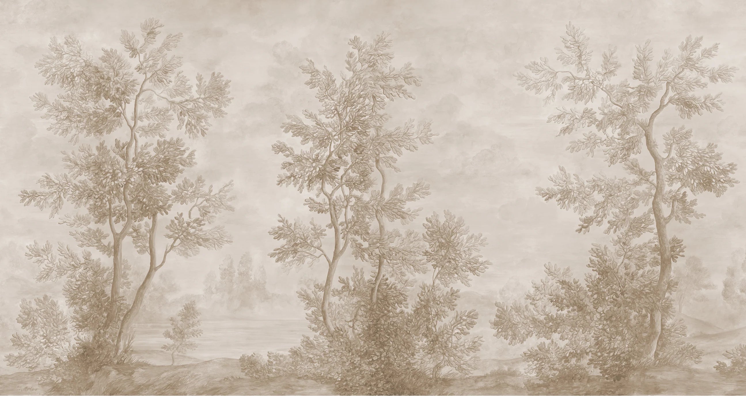 This traditionally-pigmented version of our classically inspired Lorrain grisaille scenic pays subtle tribute to the monochromatic watercolor sketches of celebrated French artist Claude Lorrain, one of the first artists to focus primarily on the landscape. Its spontaneous brushstrokes and luminous background create a feeling of movement and poetry, casting your furnishings clearly in the foreground.