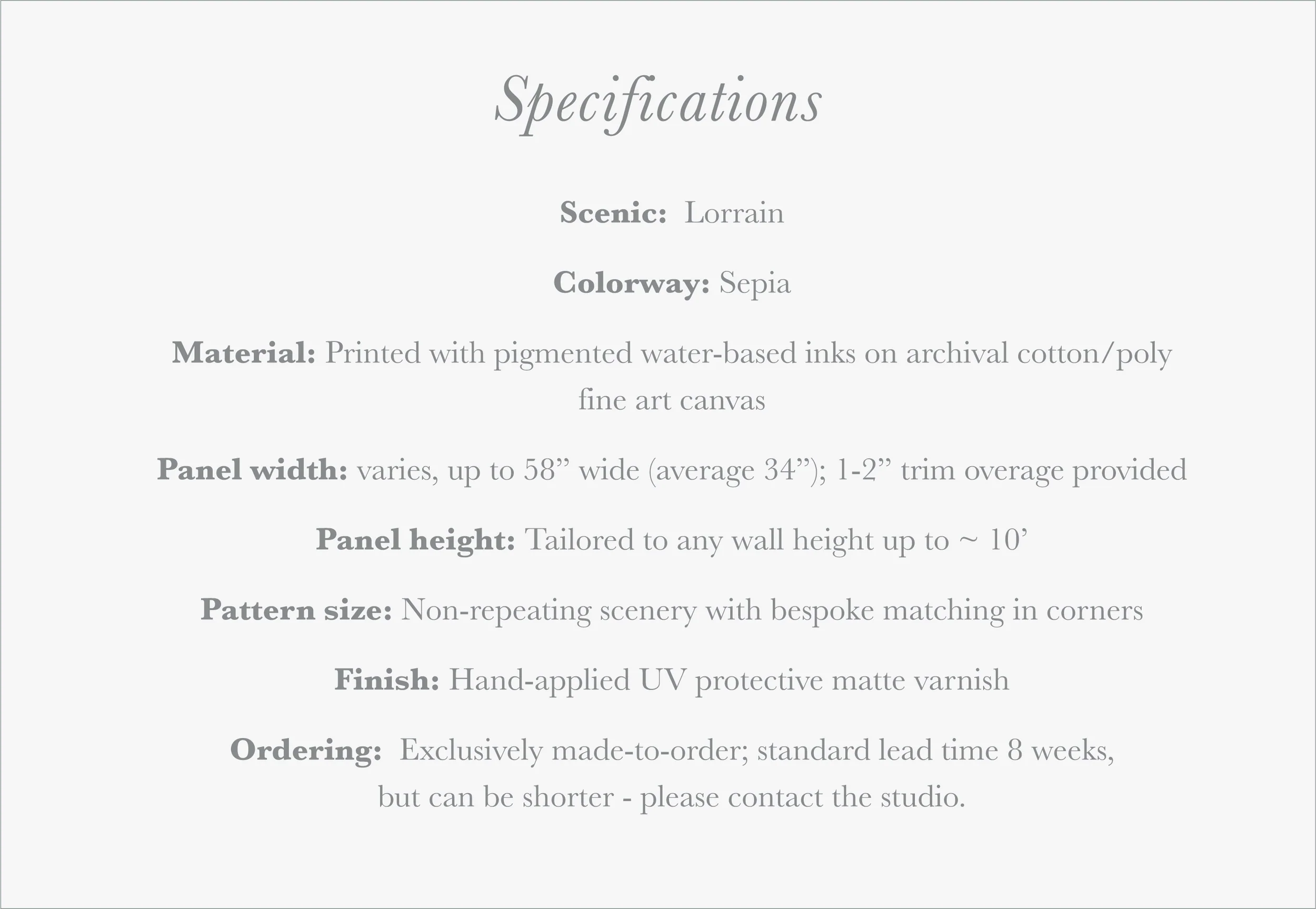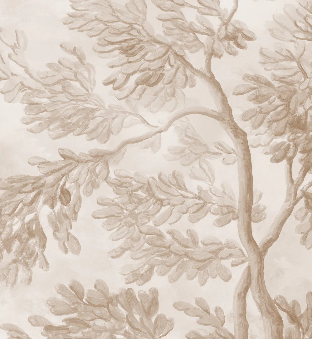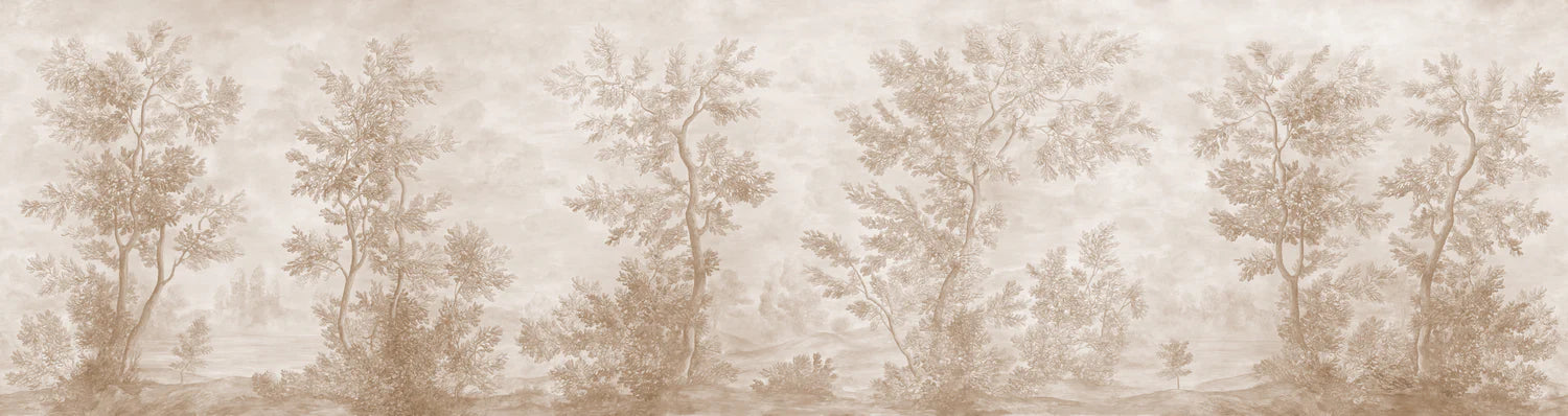 This traditionally-pigmented version of our classically inspired Lorrain grisaille scenic pays subtle tribute to the monochromatic watercolor sketches of celebrated French artist Claude Lorrain, one of the first artists to focus primarily on the landscape. Its spontaneous brushstrokes and luminous background create a feeling of movement and poetry, casting your furnishings clearly in the foreground.