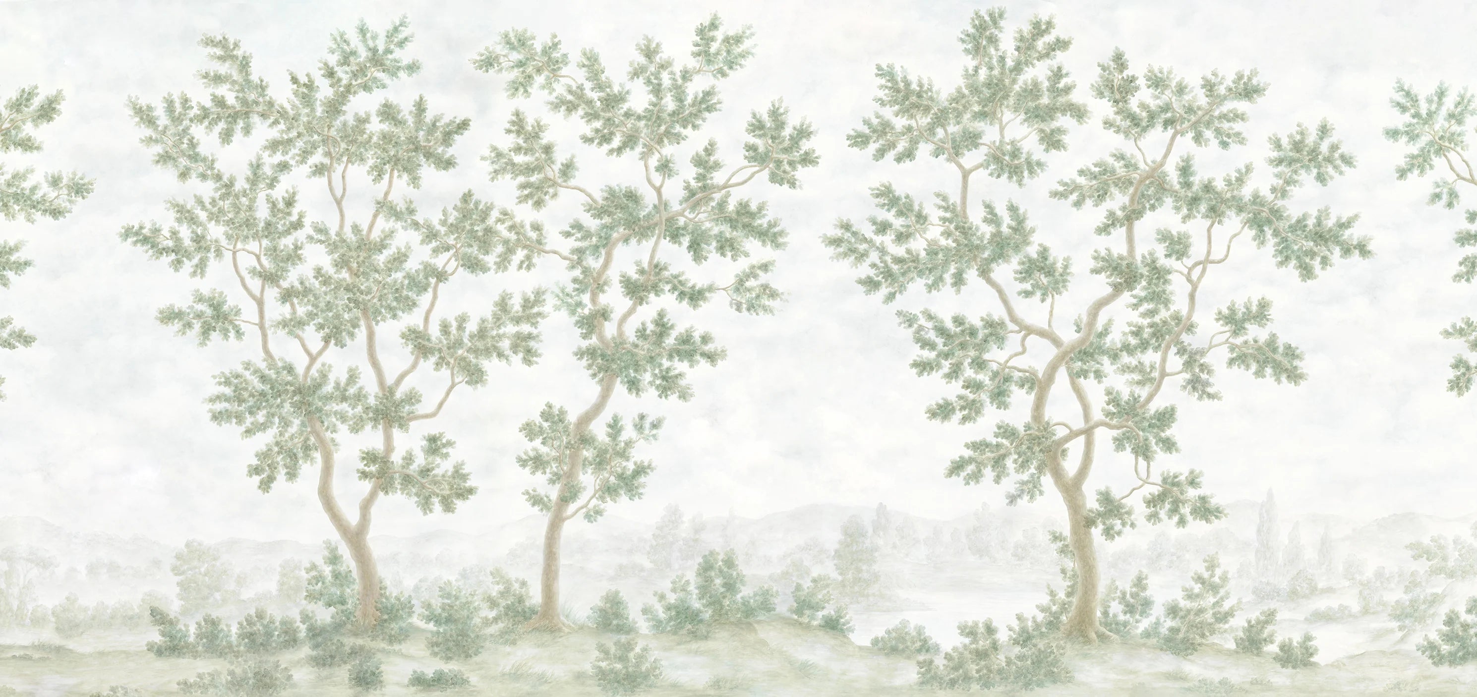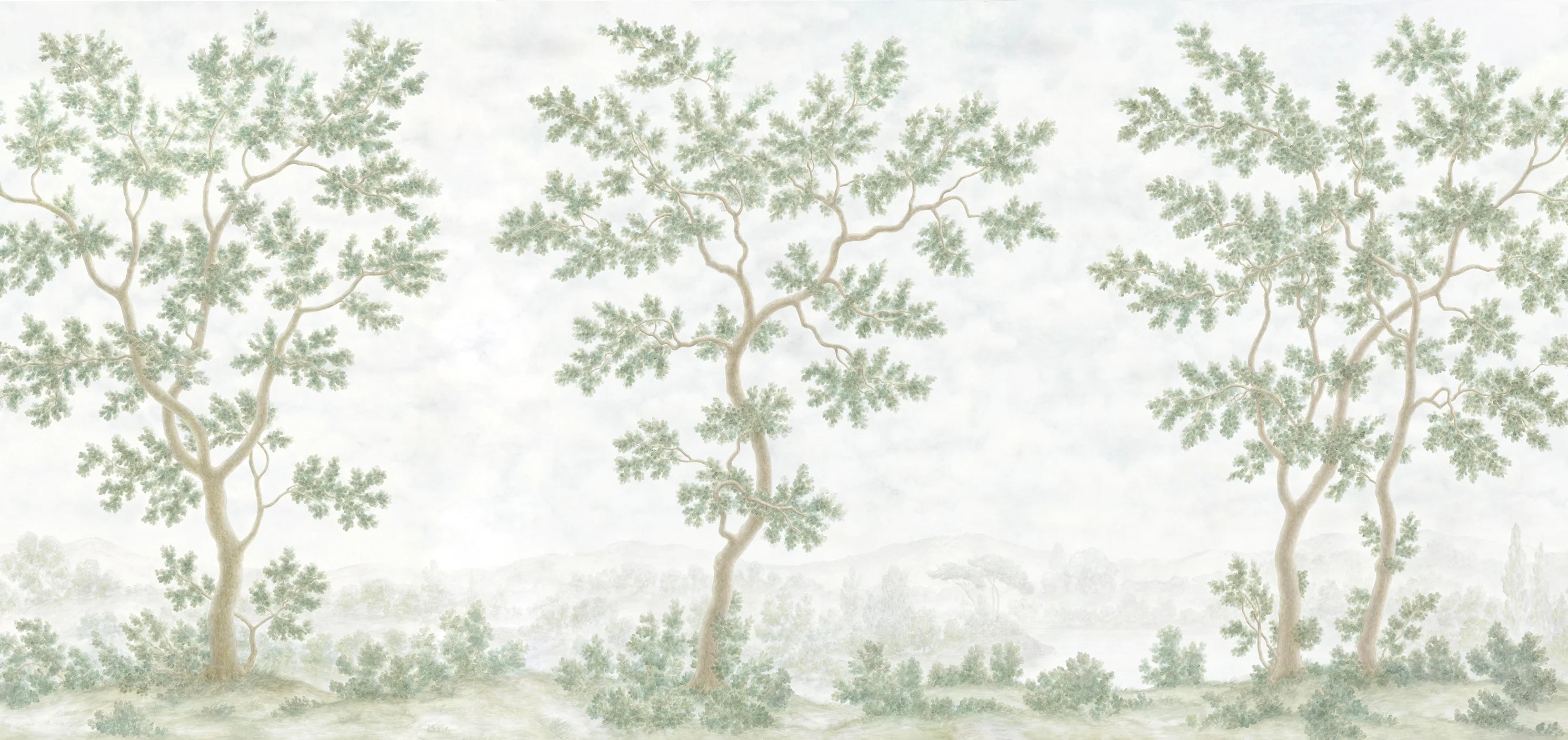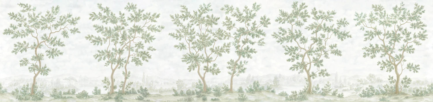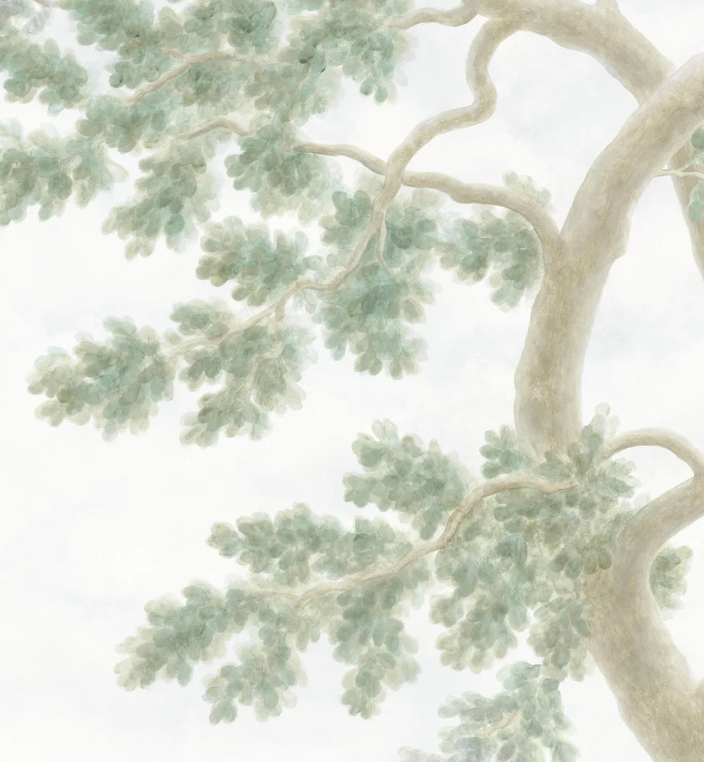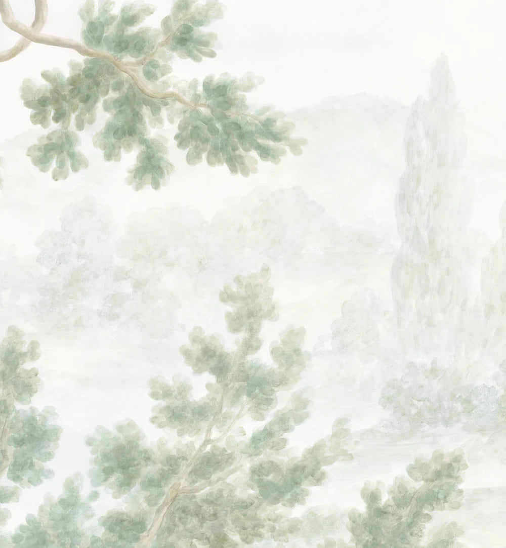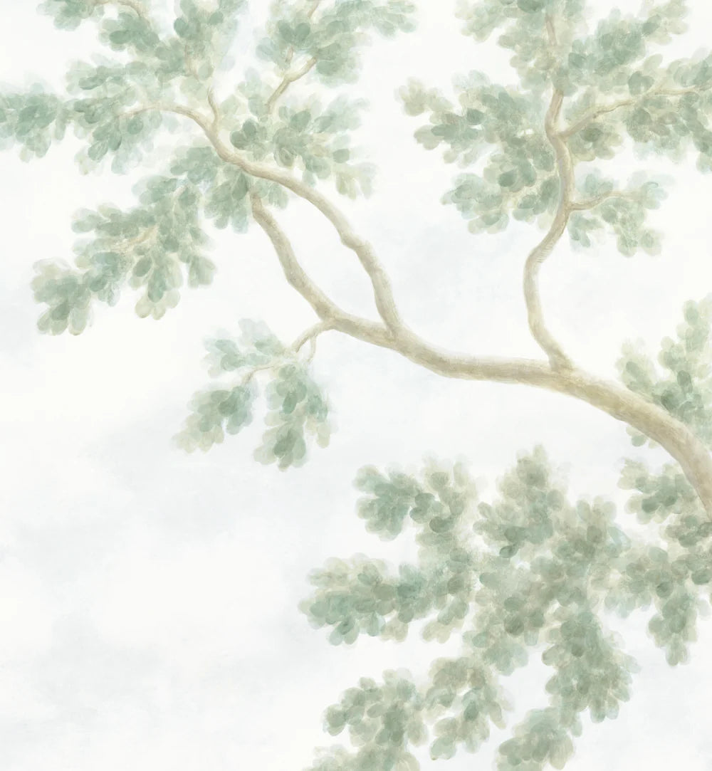 Inspired by watercolor landscapes and verdant antique tapestries, our dreamy Verdure mural gently blends the elegance of antique foliage with light, impressionistic brushstrokes. Its soft sky, ethereal background and subtle, painted-on-plaster patina complete the tranquil al fresco atmosphere.